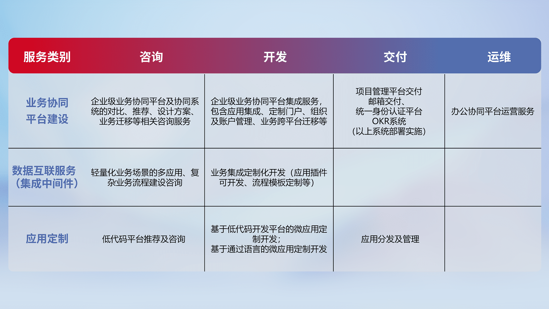 针对钉钉、、、企微、、、IDaas等平台级产品提供产品的规划、、、、方案、、、交付、、、、定制化开发等服务,,,,实现如统一协同办公、、、智能客户服务、、、混合会议管理、、、、智能数据查询、、等业务场景,,实现数字化转型。。