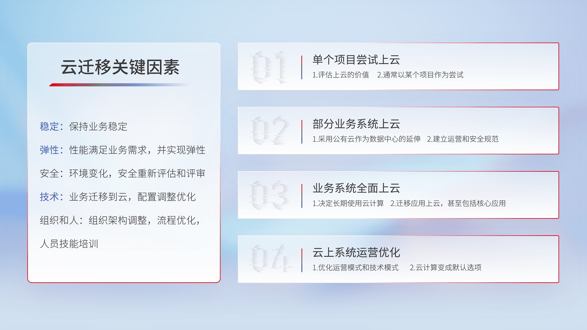 结合实际业务,,,从规划设计、、云平台选型、、、、云原生改造、、、数据迁移、、集成交付,,迁移全过程为客户识别最佳上云路径,,,,做好风险识别管理,,设计网络架构、、、身份权限、、、、安全审计合规、、、、操作审计、、日志审计、、、监控告警策略、、、多站点容灾设计等,,,,对云上基础设施进行整体规划,,,,提升IT治理水平,,以满足弹性、、高可用、、、、高性能的需求。。。。
