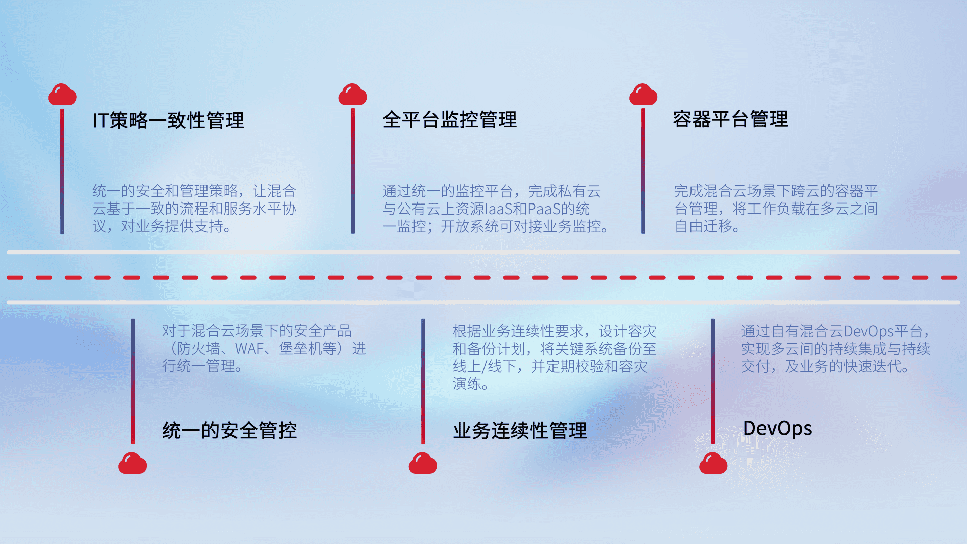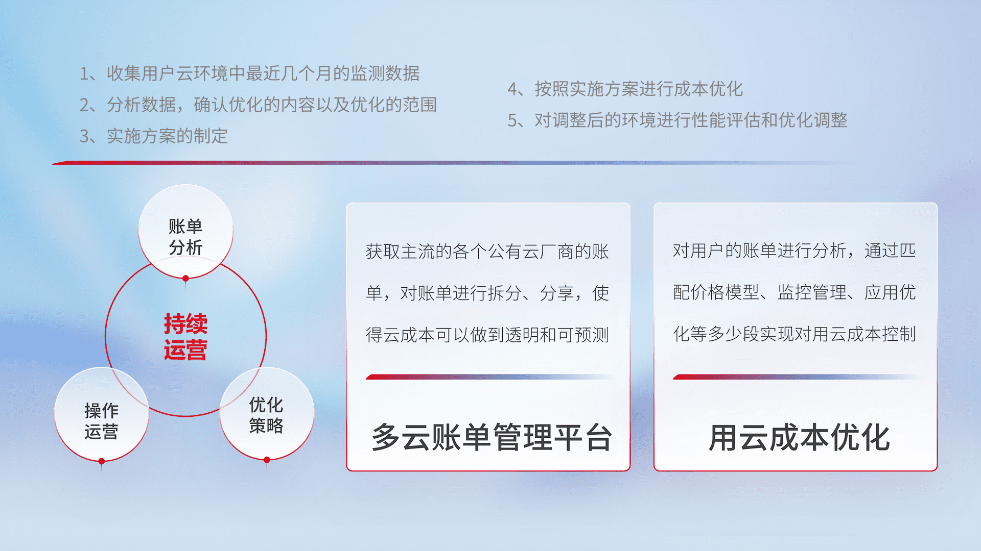 通过多云纳管,,以统一的资源数据模型把客户的云资源进行抽象和封装,,进而实现对多云资源的统一操作,,,,保障云资源管理的可靠性、、、、稳定性与可用性。。。量身定制化运维内容,,,配置、、开发运维、、、补丁管理、、备份、、监控、、、认证和访问管理、、、审计和日常巡检等,,保障在用云过程中的可靠度,,稳定度以及高可用率。。